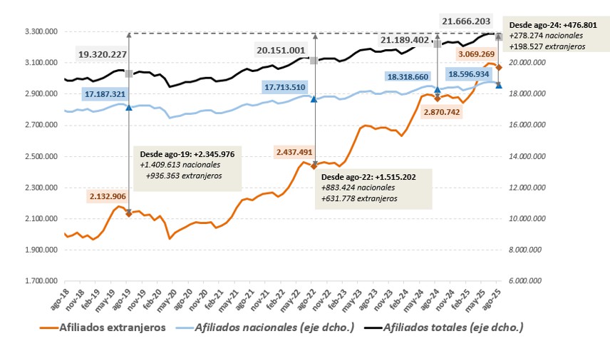 La Seguridad Social ha reportado un total de 3.047.089 afiliados extranjeros en agosto, tras ajustar los datos por efecto calendario. Este mes, la cifra de trabajadores provenientes de otros países se mantiene por encima de los tres millones, con un incremento de casi 200.000 ocupados en el último año, lo que representa un crecimiento del 6,9%. Actualmente, estos trabajadores constituyen el 14,05% del total de afiliados al sistema.