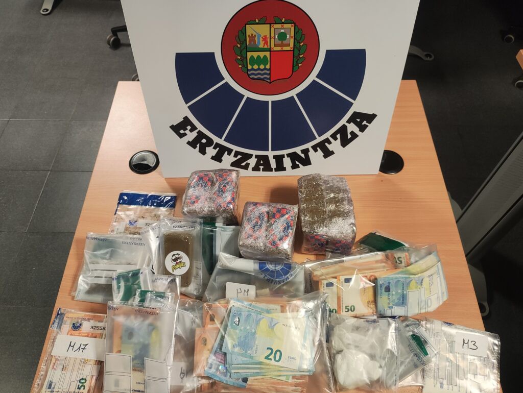 Con las evidencias recopiladas, la Ertzaintza llevó a cabo un operativo el jueves para arrestar a ambos hombres investigados por tráfico de drogas. Posteriormente, se activó la Unidad Canina para realizar registros en sus domicilios con autorización judicial. En una de las viviendas se hallaron 2,200 kilogramos adicionales de hachís, 50 gramos de sulfato de anfetamina (speed), pequeñas cantidades de marihuana, 31,700 euros en efectivo y una báscula de precisión. En la otra residencia se incautaron pequeñas cantidades de diversas sustancias estupefacientes, otra báscula y un puño americano considerado un arma prohibida.