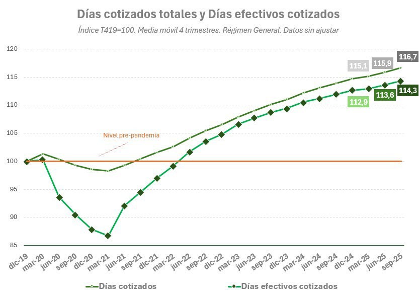 En términos concretos, el índice de días cotizados ha experimentado un crecimiento del 16,7% desde los niveles previos a la pandemia. Para obtener una visión más precisa del mercado laboral, es esencial descontar ciertos factores como los días en ERTE (Expedientes de Regulación Temporal de Empleo), las incapacidades temporales y otras prestaciones relacionadas con el nacimiento o cuidado de menores y riesgos durante el embarazo. Al considerar estos aspectos, el indicador de días efectivos cotizados muestra un aumento del 14,3% desde antes de la COVID-19 hasta el tercer trimestre de 2025.