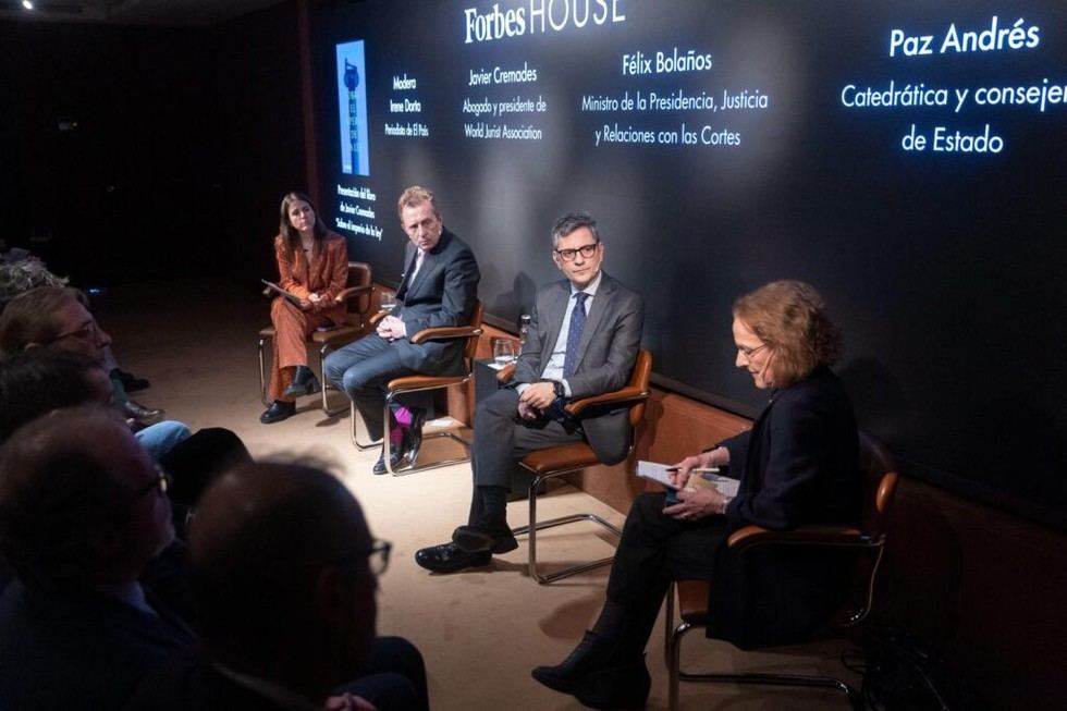El ministro de la Presidencia, Justicia y Relaciones con las Cortes, Félix Bolaños, participó este lunes en un coloquio centrado en el Estado de Derecho y el imperio de la ley. El evento contó con la presencia de Paz Andrés, consejera permanente del Consejo de Estado, y Javier Cremades, quien presentó su nuevo libro.