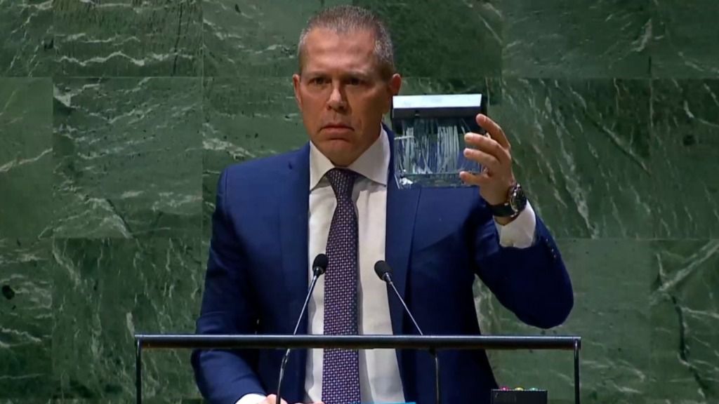 El embajador israelí, por su parte, sostuvo que el texto concede derechos y privilegios al futuro Estado terrorista de Hamas y sacó una pequeña trituradora de papel en la que metió una copia de la carta de la ONU acusando a los estados de destruirla.